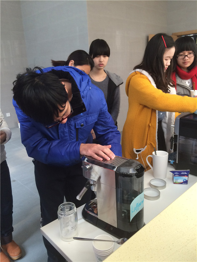 同学们纷纷在吧台后围观咖啡的制作过程