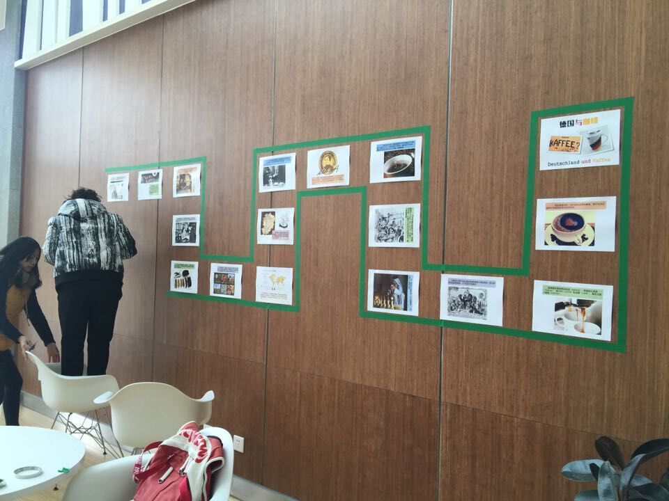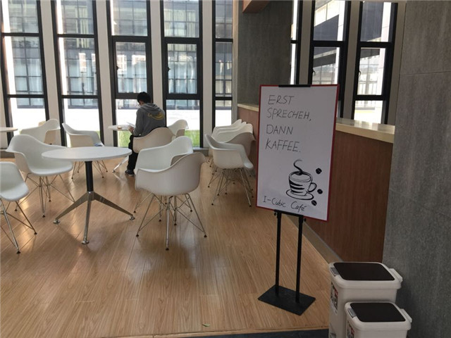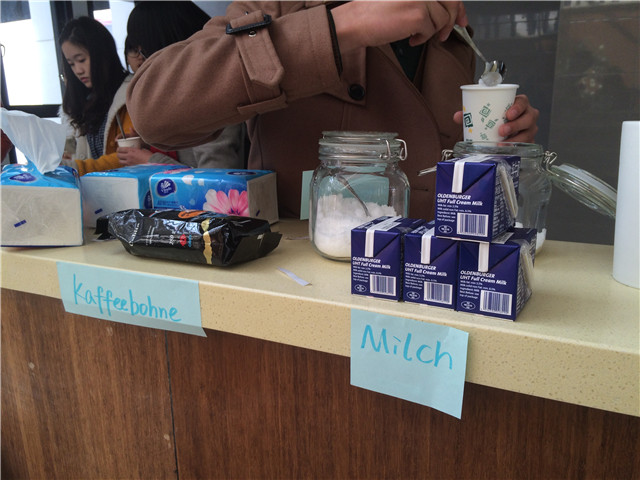 我们的临时手绘招牌:Erst sprechen, dann Kaffee. (中文意为:请先开口说德语,才能喝到咖啡。)
