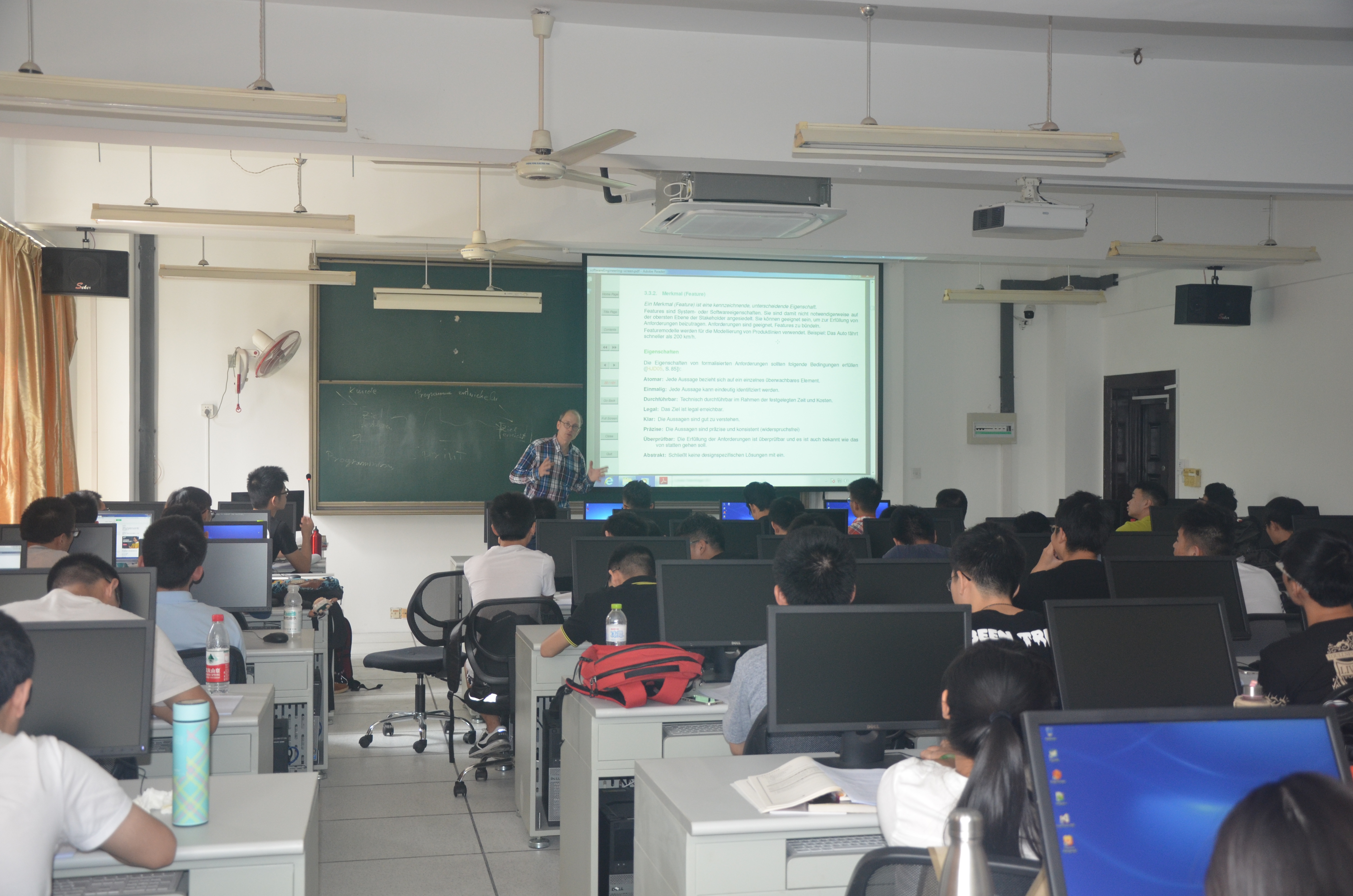 在教学的过程中布劳尔教授十分耐心的为同学们提供了软件工程技术方面的讲述与指导。在布劳尔教授的带领下,同学们对软件工程学科所运用到的计算机工具都有了较为全面的熟悉,同时也能够独立的去运用这些工具完成课后练习,布劳尔教授针对课后练习中同学们存在的问题都进行了单独的讲解,对于较多同学同时存在的问题,布劳尔教授则是在黑板上为同学回顾之前的知识点,并提醒同学如何纠正错误。