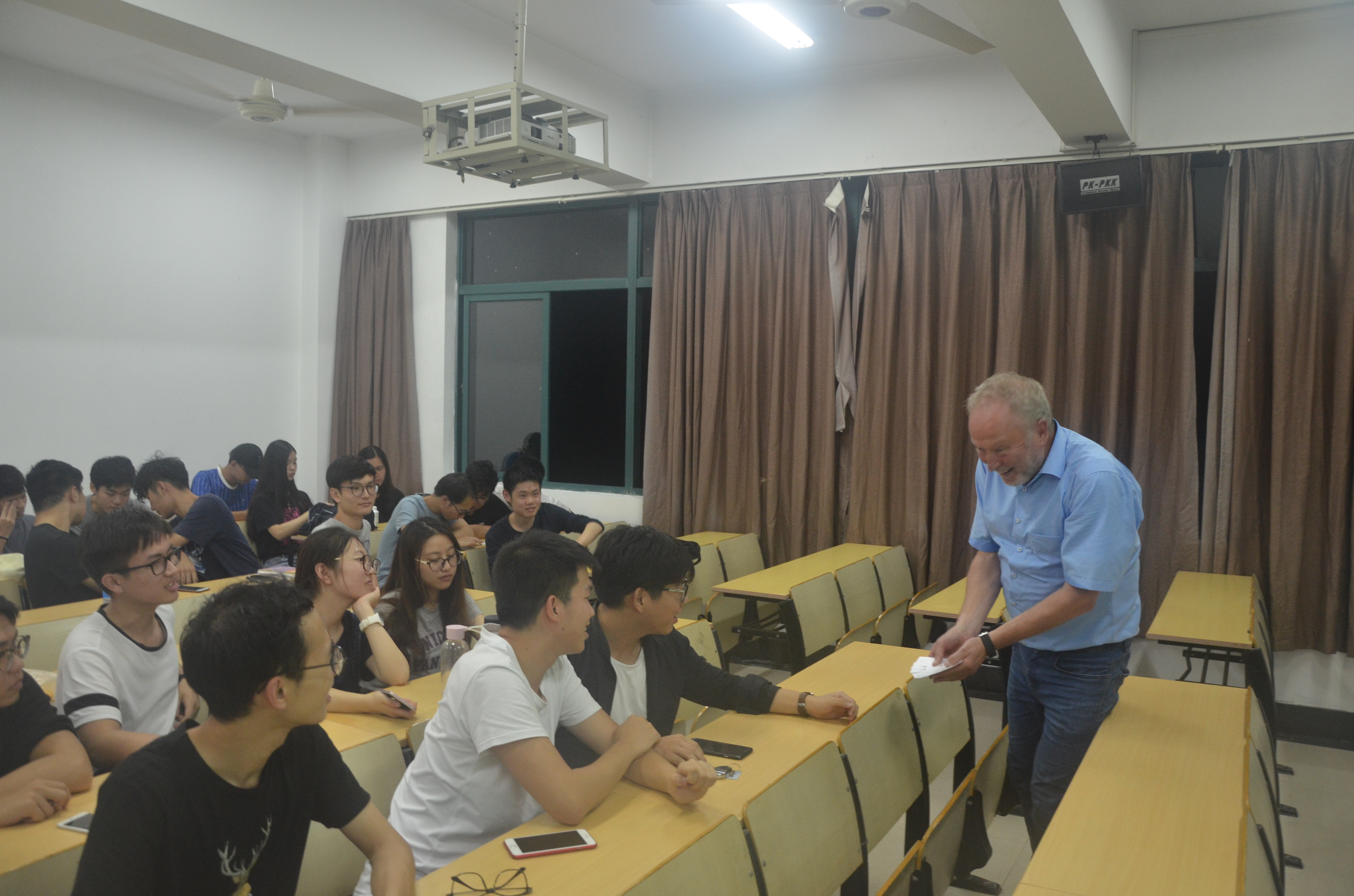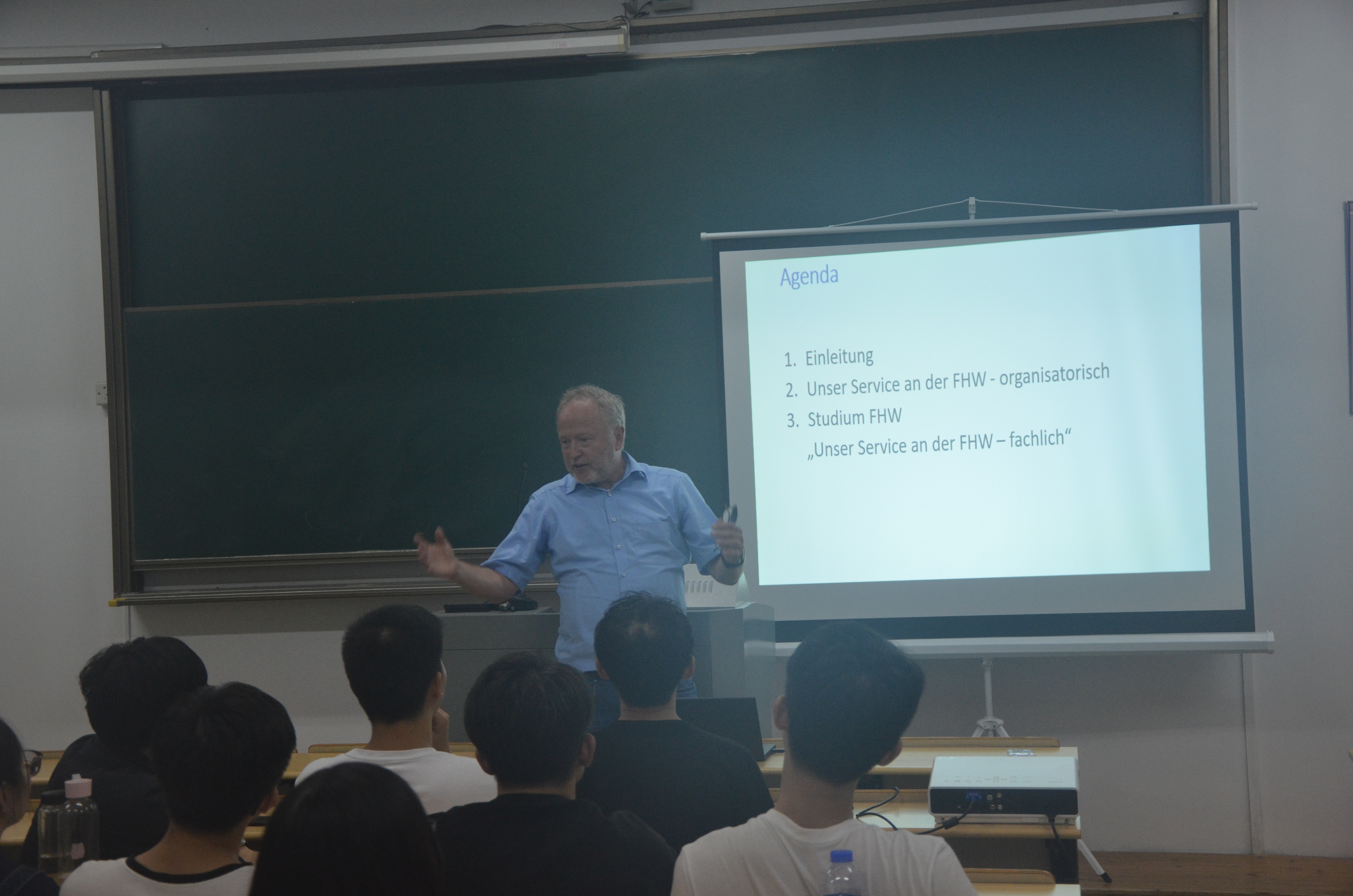 2017年9月28日18时30分于浙江科技学院小和山小区B4楼421教室,德国西海岸应用科技大学工程学院院长、德方专业负责人Detlef Jensen教授向14和15级电气专业学生进行了 关于“西海岸应用科技大学对我院交换生生活以及学习方面服务”的讲座。