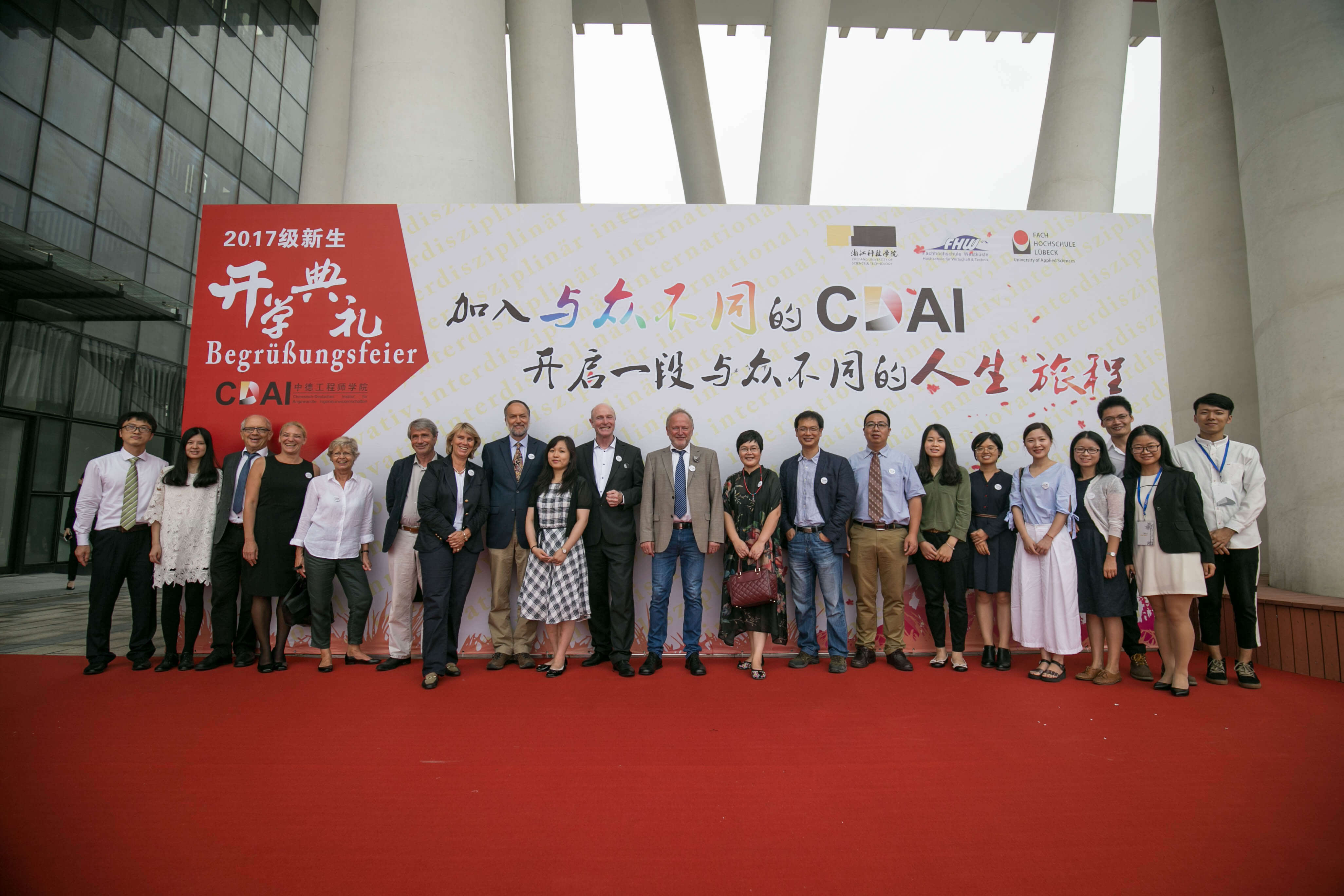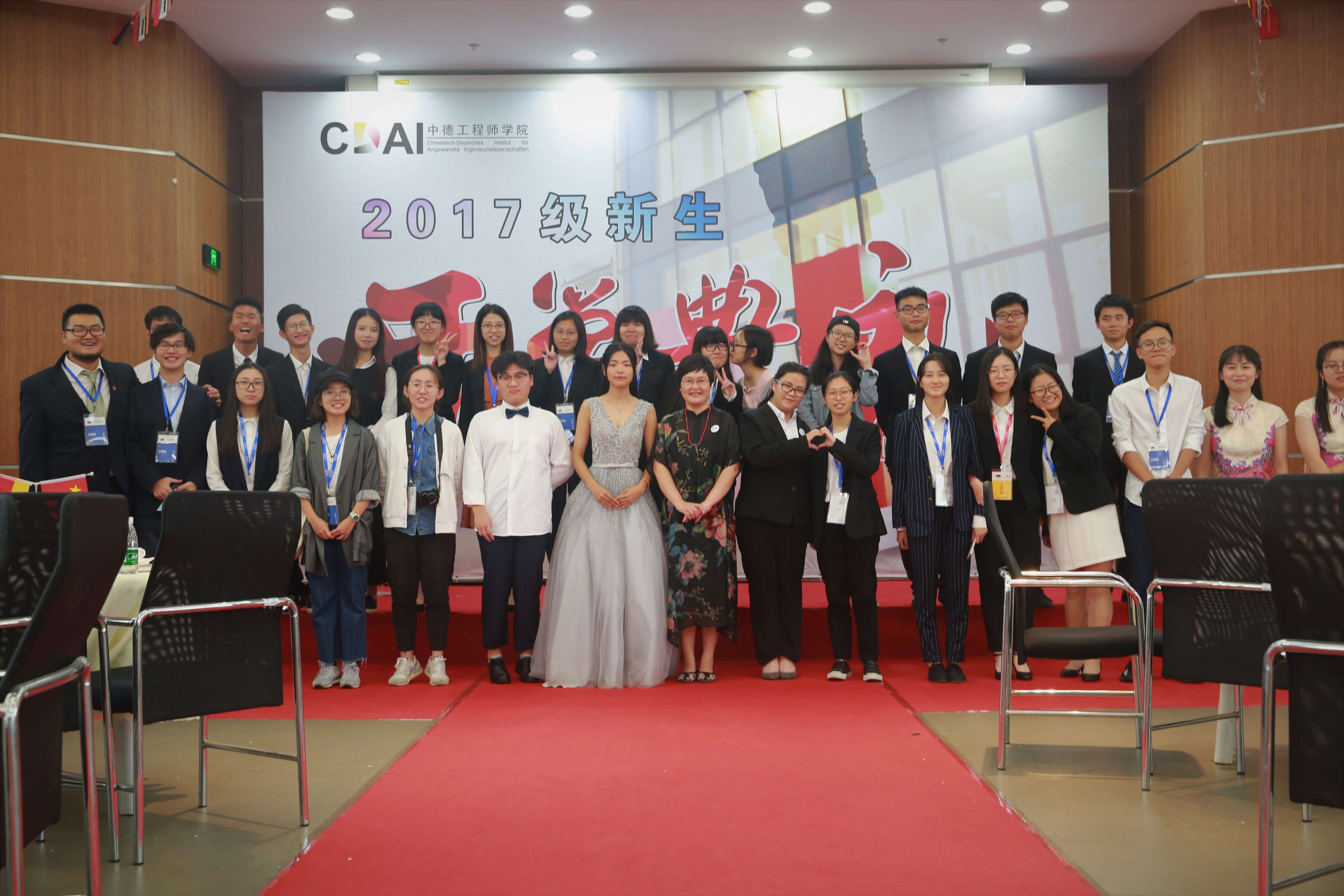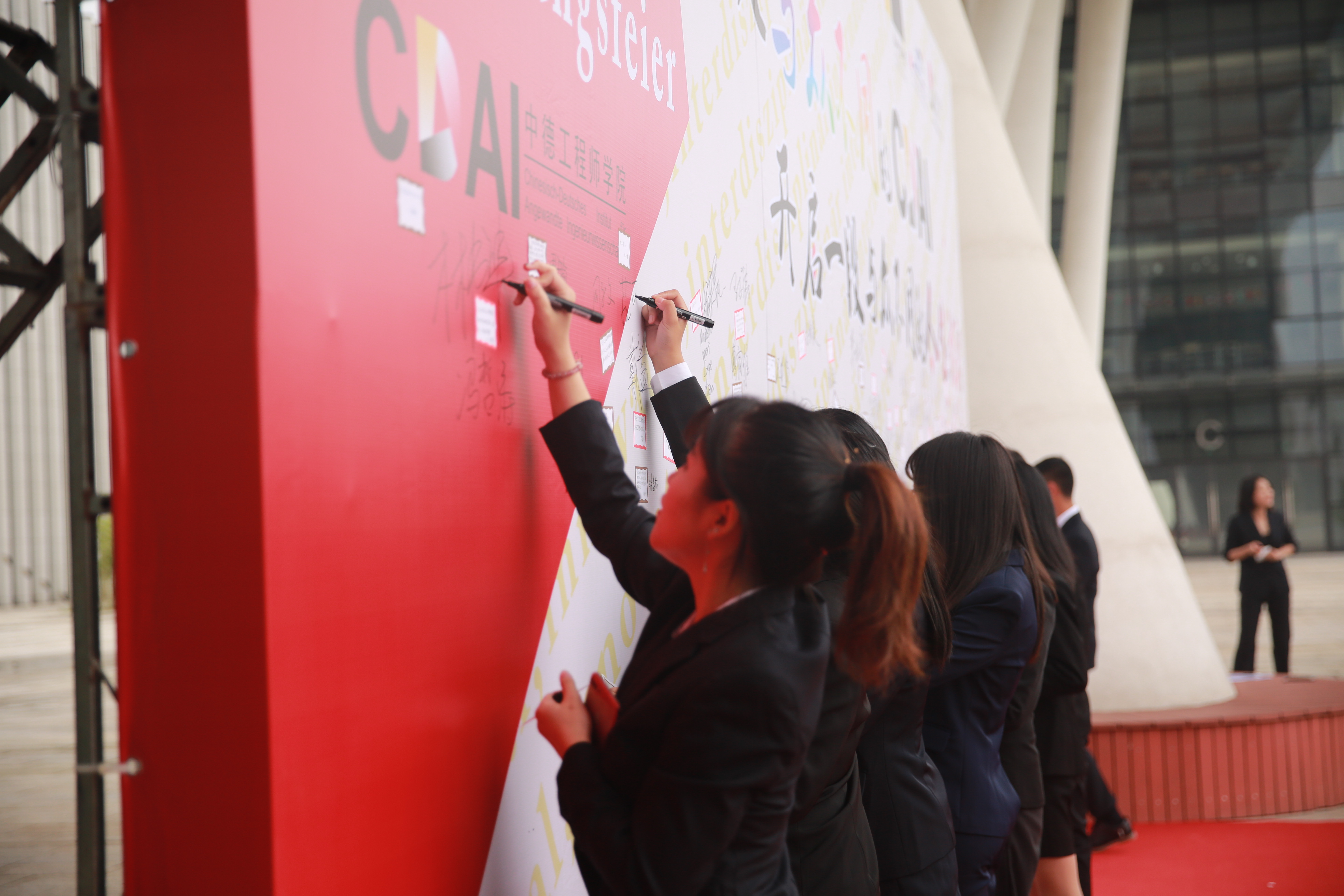 14:00,17级新生身着挺拔正装陆续走上红毯,在背景墙上贴下对未来的期许、签名并合影,从中德双方教师手中接过“Ich liebe CDAI”明信片与院徽,参观学院简介和机器人团队的展示,庄重而活泼。