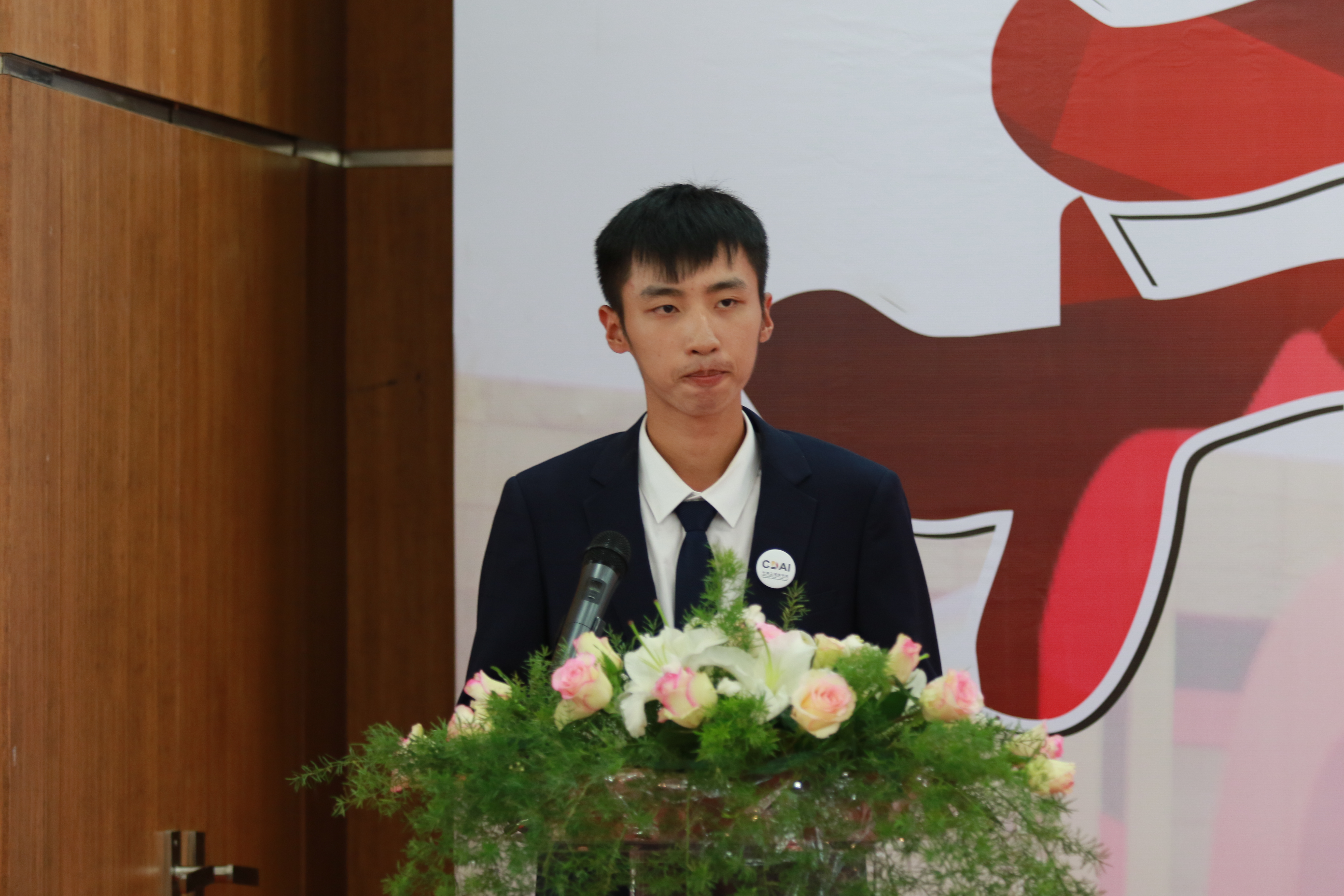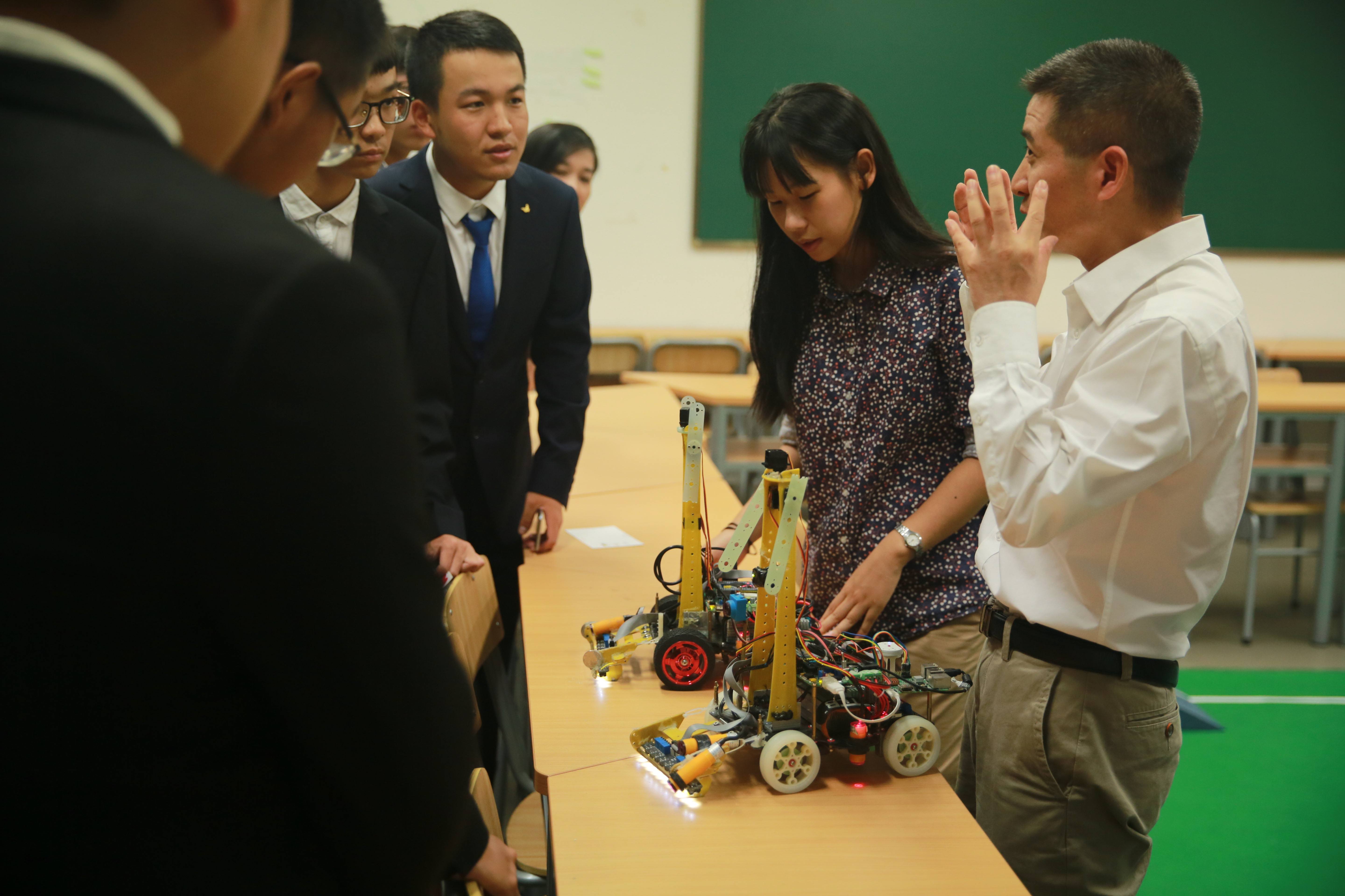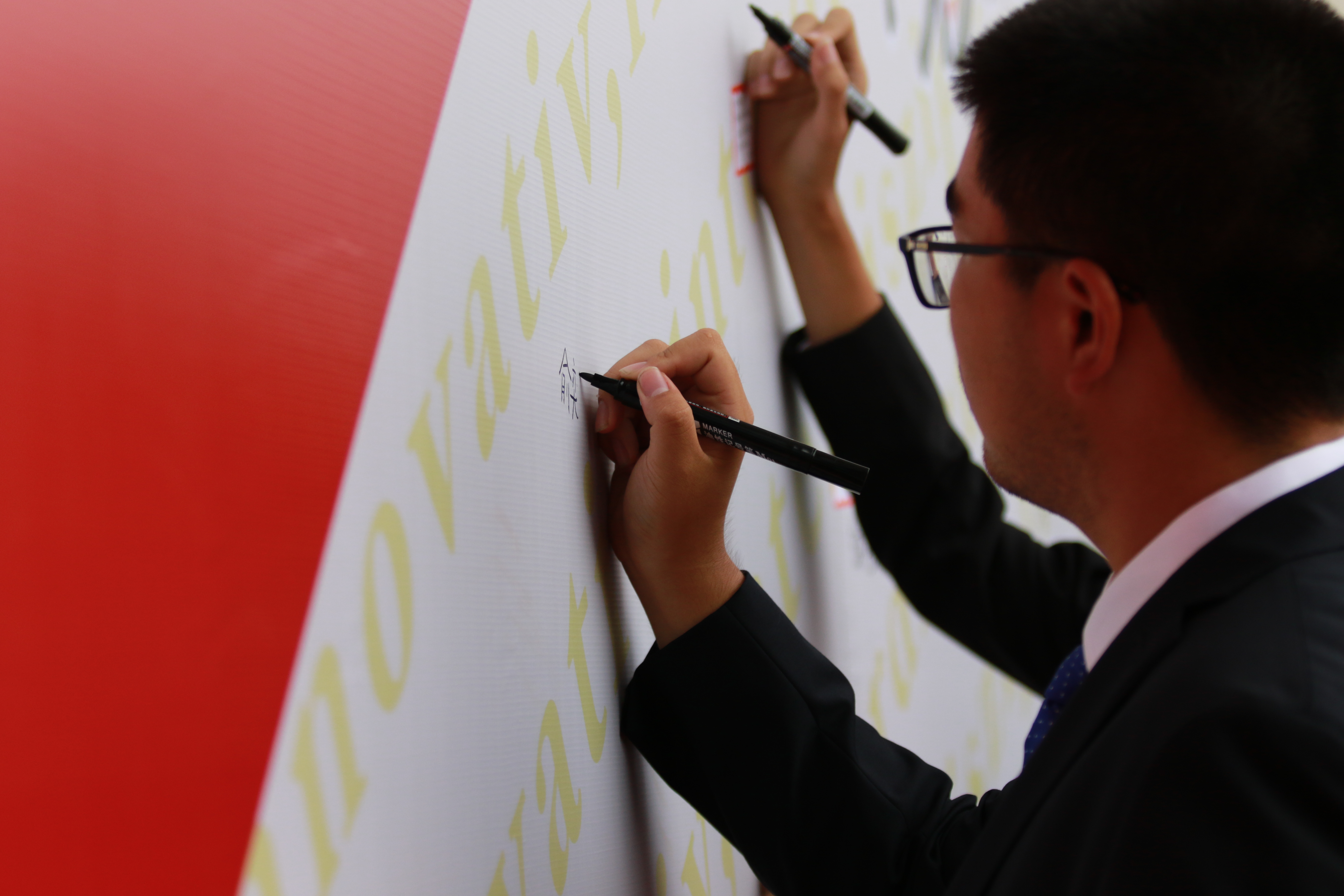 14:00,17级新生身着挺拔正装陆续走上红毯,在背景墙上贴下对未来的期许、签名并合影,从中德双方教师手中接过“Ich liebe CDAI”明信片与院徽,参观学院简介和机器人团队的展示,庄重而活泼。