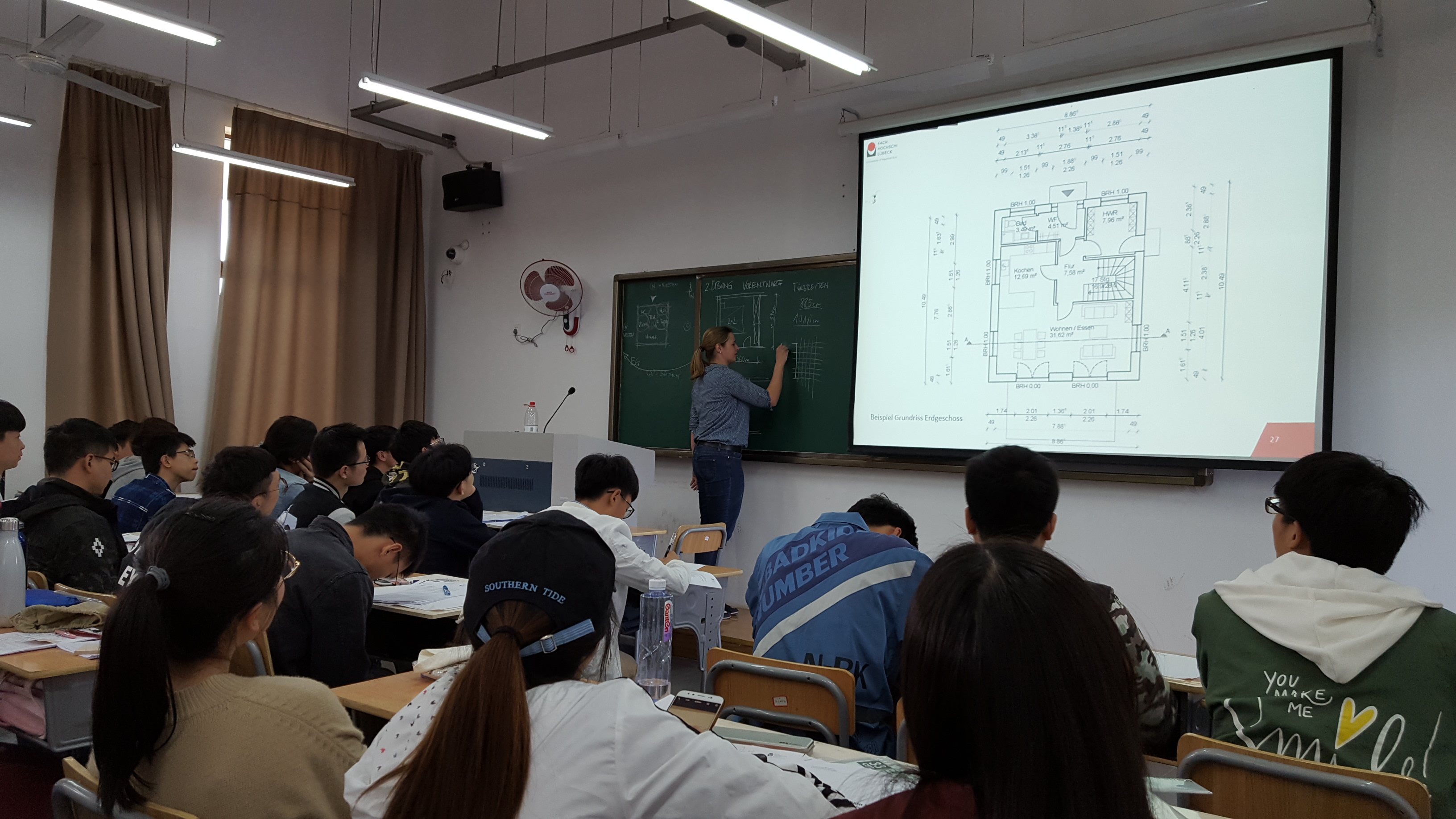 2018年4月9日,来自德国吕贝克应用科技大学的助教Jan Osten与Wiebke Martensen,为我院土木工程专业2016级学生讲授为期一周的建筑构造补充课程。在一周时间内,两位教师充分安排时间进行课程设计教学,以德国普通家庭住宅为例,从最基本的气泡图开始进行设计,逐步将学生心中想象的住宅实现为实际建筑施工图。
