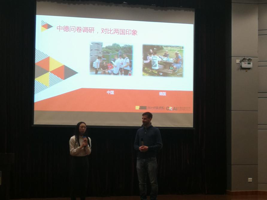 大会上,我院代表吴双同学通过“参观主题学习,增强党性修养”、“德国名企参观,感受科技力量”以及“多地街头参访,一窥中德合作”三个方面,向大家详细介绍了这次以“与改革同行,与世界同步”为主题的暑期社会实践活动。从观看《厉害了我的国》感受中国崛起的热泪盈眶,到参观浙江美术馆学习改革开放背景下敢为人先的时代精神,再到赴井冈山革命博物馆了解革命老区人民艰苦奋斗的历程,Verbreiter团队成员们通过观展、看视频,提高党性修养。在德国吕贝克,团队成员参观了德国石荷州“H+H”公司、“Dräge”公司。干净的车间,现代化的生产及科学的管理,成员们近距离感受到科技的魅力和德国工业4.0的先进。同时团队精心准备了中德两个版本的调查问卷,分别在杭州与德国海德进行发放。共回收有效问卷73份。通过数据对比分析对于中德两国人民在产品、技术和国家战略的认识方面有了更直观的了解。