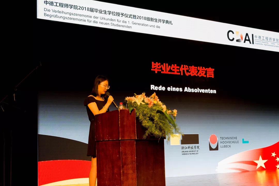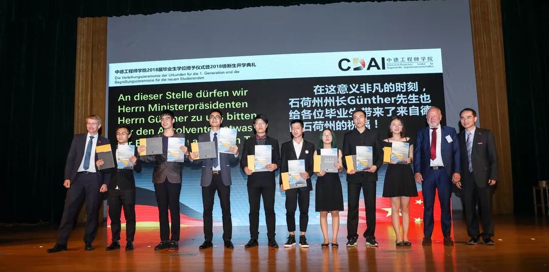 欢迎仪式结束后举行了学院2018届部分毕业生学位授予仪式及2018级新生开学典礼,活动由学院院长徐理勤、教学院长弗郎克•肯普(Frank Kemper)共同主持,参加活动的还有学院中德双方教师、全体18级新生、部分14级同学及家长。校长叶高翔与西海岸应用科技大学工程学院院长德特勒夫•廷森(Detlef Jensen)向我院18届部分毕业生颁发中德双学位证书,同时君特先生为毕业生佩戴徽章并赠送礼物。党委副书记赵东福宣读获得2018级新生奖学金名单,中德双方领导为获奖者颁奖。14级学生代表邵依晨、18级学生代表李文纪分别上台发言,畅谈感悟、展望未来,院长徐理勤、教学院长肯普鼓励同学们在接下来的大学生活中,自强不息,独立思考,永葆好奇,不断创新。