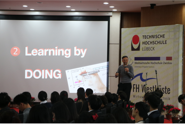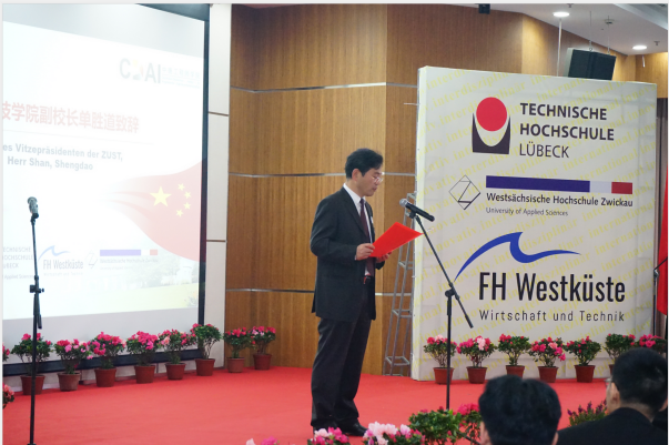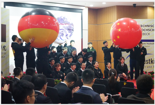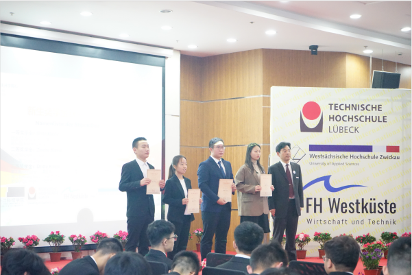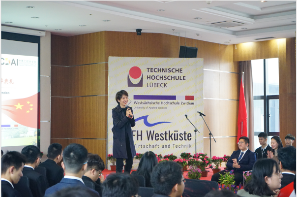 典礼在学院薛文副院长与教学院长坎普教授的共同致辞中拉开了帷幕。典礼第一幕为“喜迎新生”。首先,单校长介绍了学院的特色与优势,并向新生们表达了热烈的欢迎与诚挚的祝愿。受疫情影响,吕贝克应用科技大学的Schwartze副校长和茨维考应用科技大学的Schumann教授未能来到典礼现场,他们通过视频的形式向新生表达了最真挚的问候。