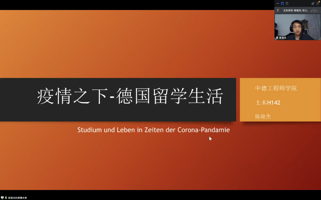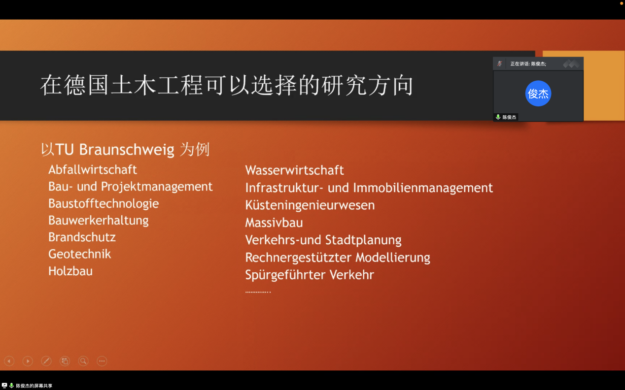 首先,陈学长详细介绍了自身经历,分享了国内2.5年的学习感受、顺利通过吕贝克应用科技大学选拔出国的交流体验、申请德国研究生的心得体会、研究生阶段的学习感悟等。随后,陈学长就德国研究生申请的问题,特别是德国精英大学的申请条件及目前自己所就读的德国布伦瑞克工业大学的学习经验做了分享。结合他身边同学的就业情况及部分案例,增强了同学们对土木行业的信心。最后,他还告诫同学们不要因周围人对土木行业的负面评价而轻易放弃,鼓励同学们要有自己的想法,不断提高自身能力。