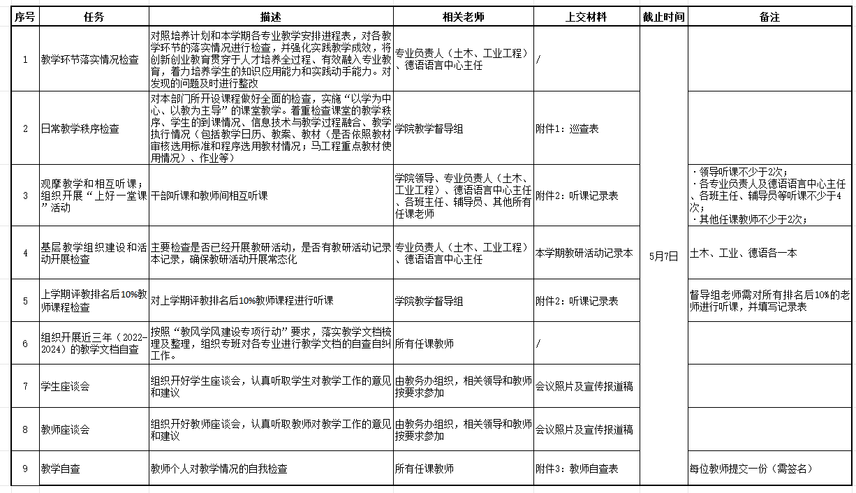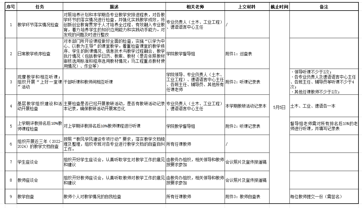 学校定于第9周、第10周(4月21日~5月2日)进行期中教学检查。现将我院期中教学检查任务分配如下表,请老师们按要求及时完成任务并将相关材料纸质版交至B4-518办公室,电子版发送至邮箱jw.cdai@zust.edu.cn。