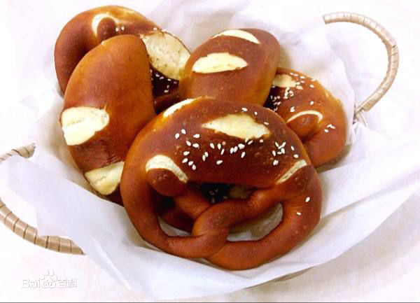 德国碱水面包,又称作巴伐利亚碱水面包,是一种德国小吃,主要原料是面粉。这款面包在欧洲盛行,特别是德国。