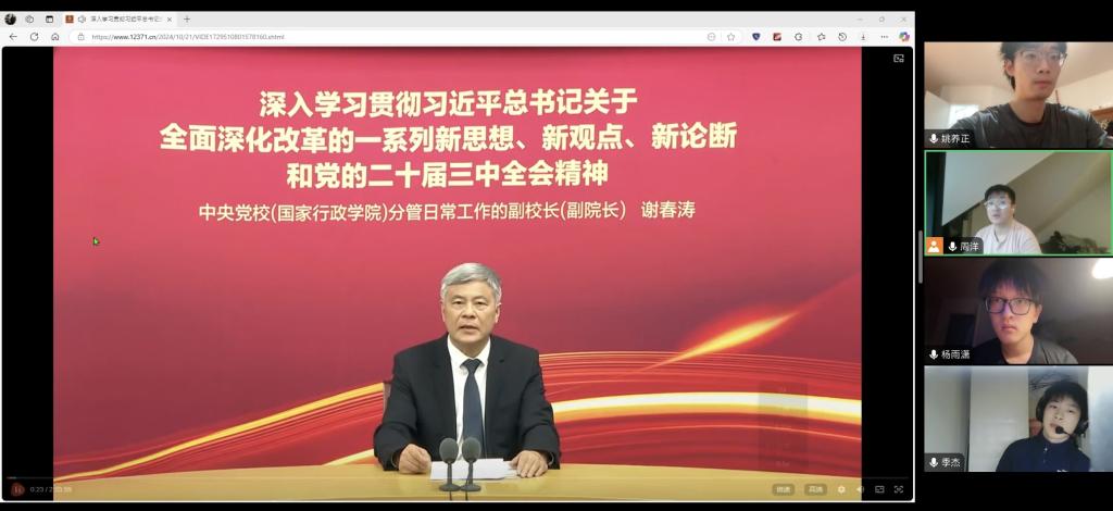 支部在校党员线下集中观看学习了谢春涛同志讲授的深入学习贯彻习近平总书记关于全面深化改革的一系列新思想、新观点、新论断和党的二十届三中全会精神,在德党员同学也同步进行了线上学习。谢春涛同志从全会主题出发,系统阐释了全面深化改革的背景和必要性,详细解读了习近平总书记的重要讲话精神及全会报告的核心内容。学习结束后各位党员分别提交了自己的学习感悟。